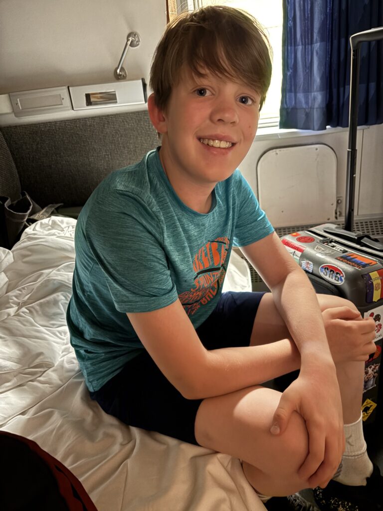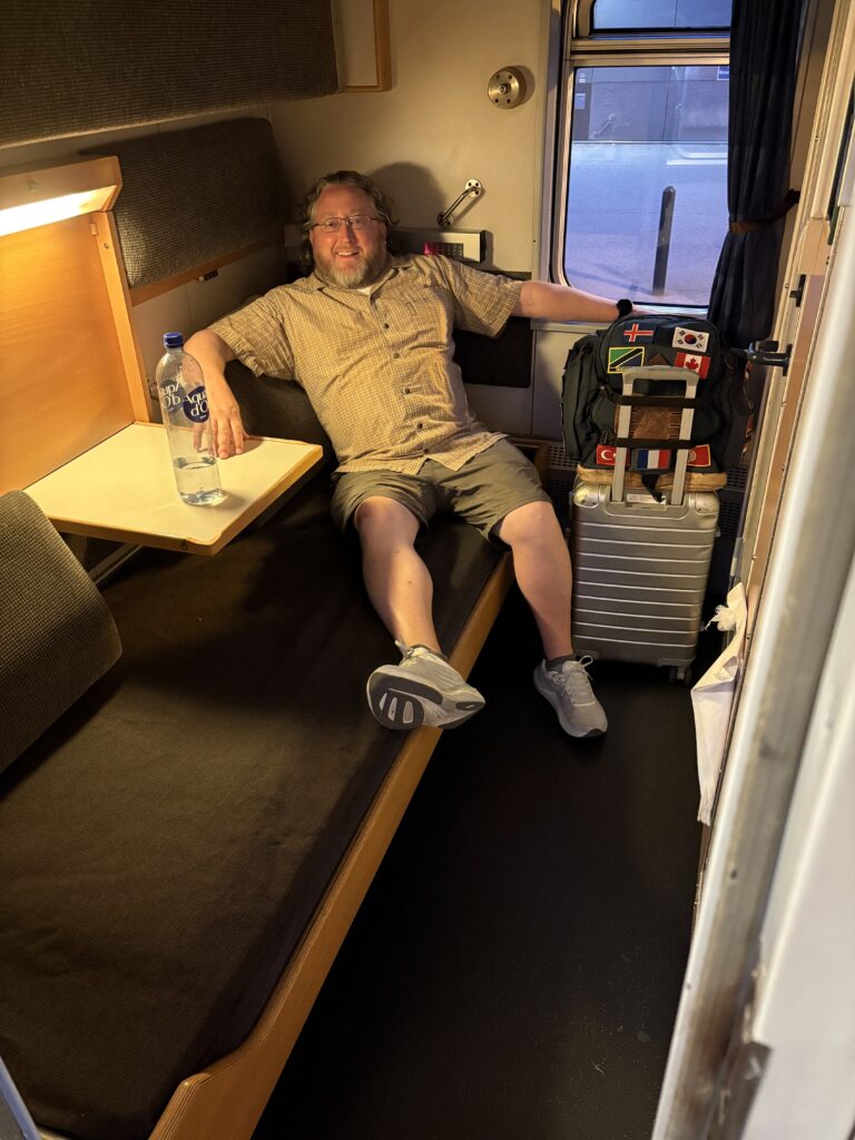 Our next train arrived on time, at 10:00 PM, and we successfully got on. We lucked out (not) by getting the one car without air conditioning, which had been baking in the hot sun all day. It was probably low 80s Fahrenheit. BUT—since we got first class tickets as a whoopsie doo apology gift from the train people, we got a free breakfast that came with the ticket.