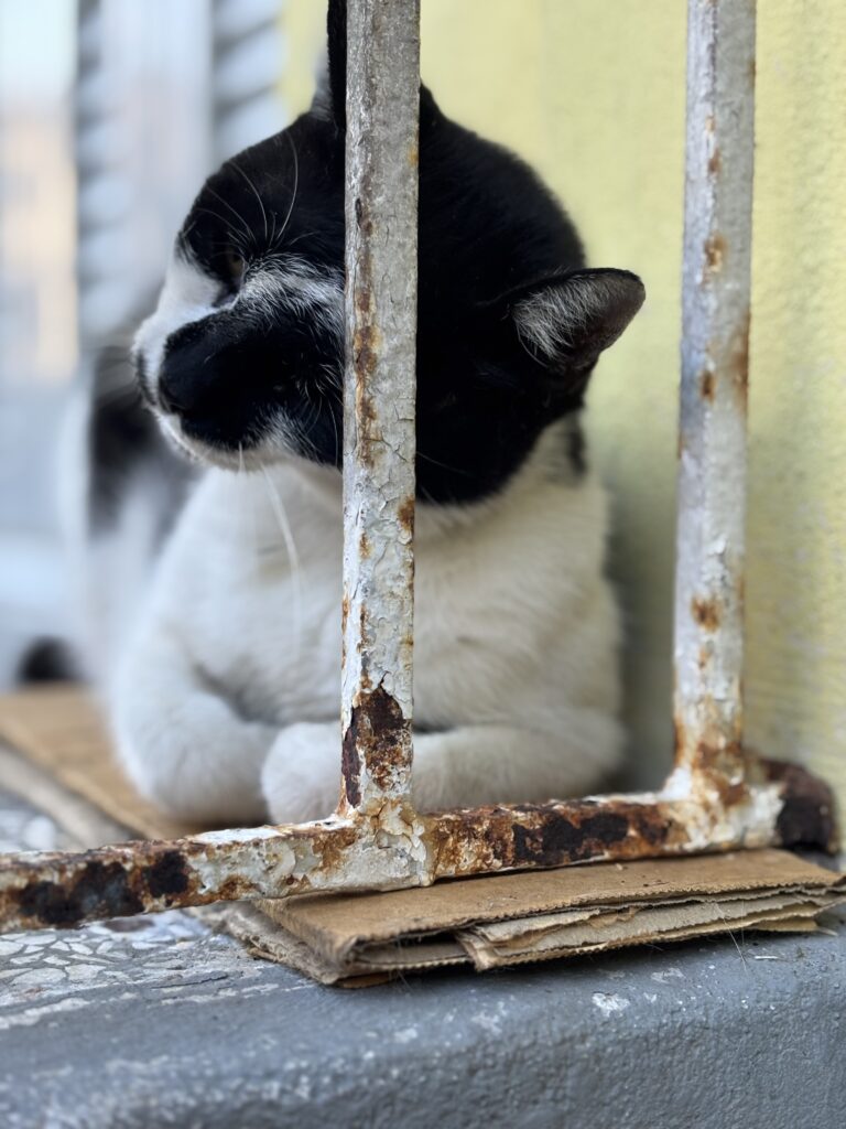This sweet kitty was perched just outside the door to our apartment building, often resting on its cardboard and nuzzling against the rusty rail